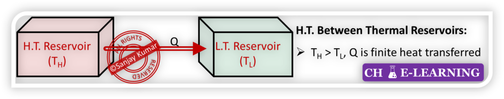 Consider two thermal reservoirs: a hot reservoir at temperature TH and a cold reservoir at temperature TL, where (TH > TL). A finite quantity of heat Q is transferred from the hot reservoir to the cold reservoir.