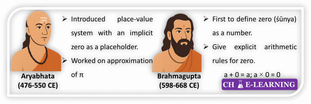 - Invention of zero and the decimal system by Aryabhata (आर्यभट्ट 476 CE – 550 CE) and Brahmagupta (ब्रह्मगुप्त 598 CE – 668 CE).